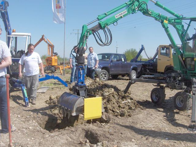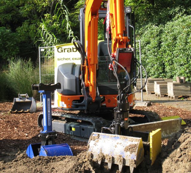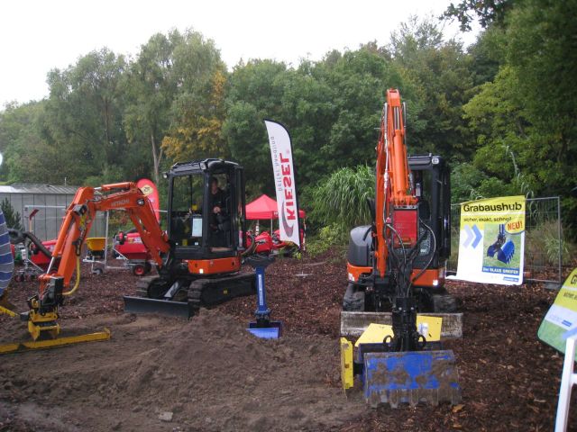 Baggervorführgelände des gemeinsamen Stands. BLAUER GREIFER, Zinsser Greiferführung, Hitachi Bagger, encon Tilt Rotator